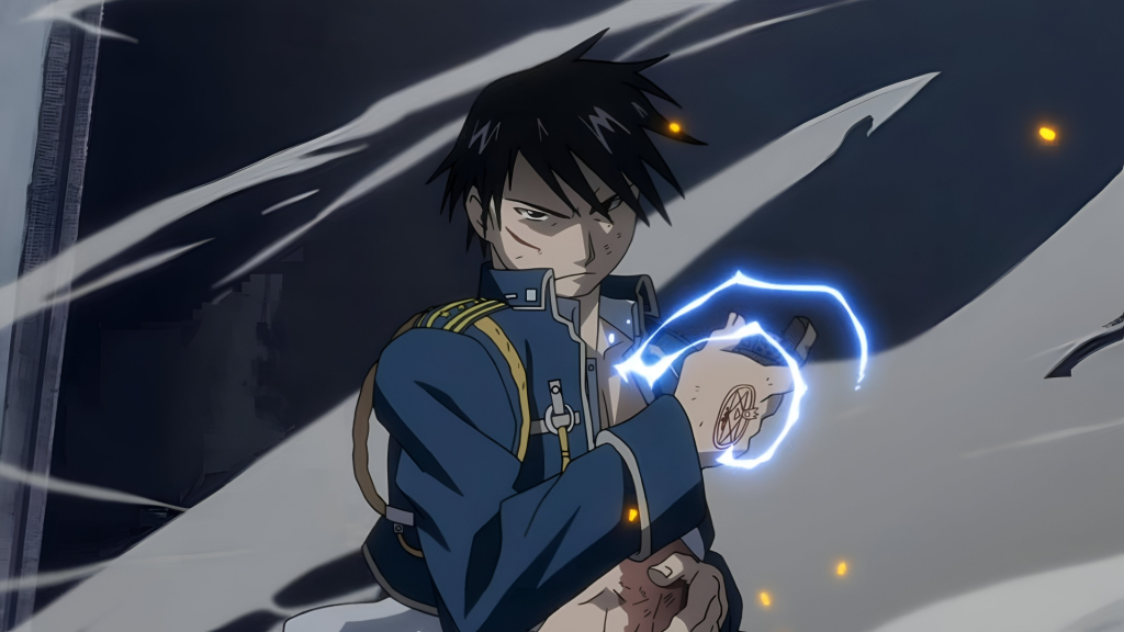 The Flame Alchemist operates on calculated ambition hiding genuine grief. His goal is to become Fuhrer — not out of ego but because he watched people he loved die in a war he believes could have been prevented by better leadership, and he intends to become the person who prevents the next one. That backstory, delivered gradually across the series, gives every scene he’s in additional weight.