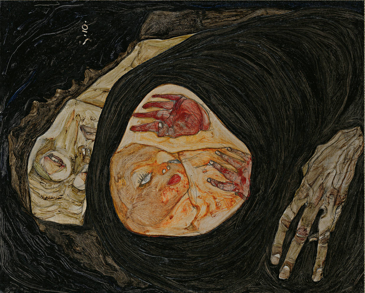 One of the most unsettling references in the opening draws from Egon Schiele’s Dead Mother, a painting born from emotional absence rather than comfort. Schiele’s original portrays motherhood as hollow and suffocating, stripping the womb of warmth and turning it into a space of quiet dread.